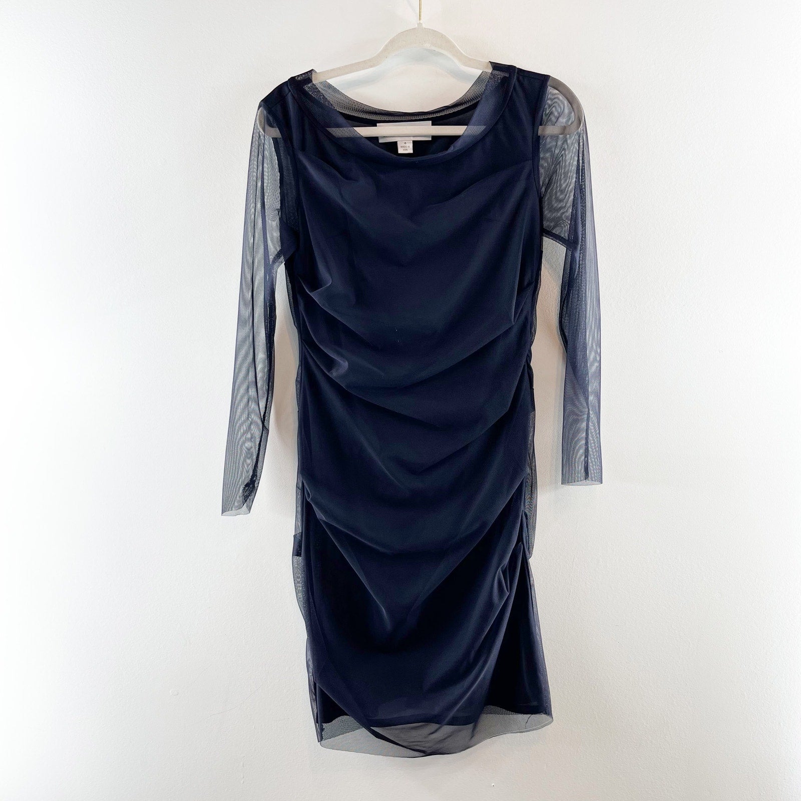 Sara Campbell Ruched Drapey Mesh Sleeve Lined Sheer Overlay Shift Dress Blue 4