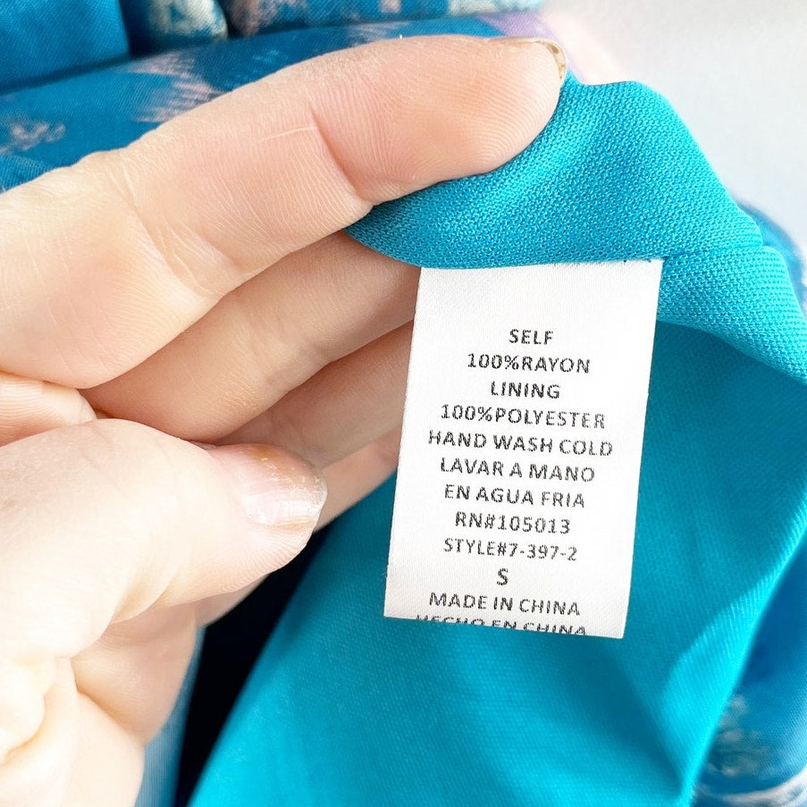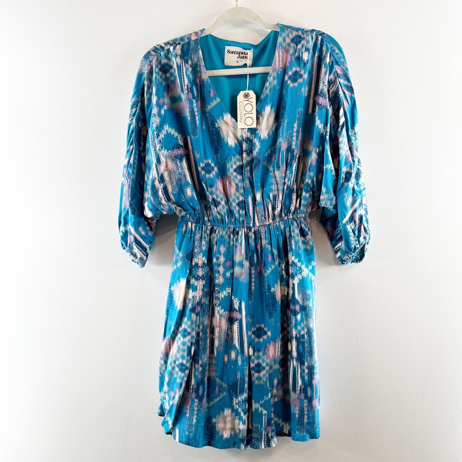 Savanna Jane Printed 3/4 Sleeve Peasant Mini Dress Teal Blue Small