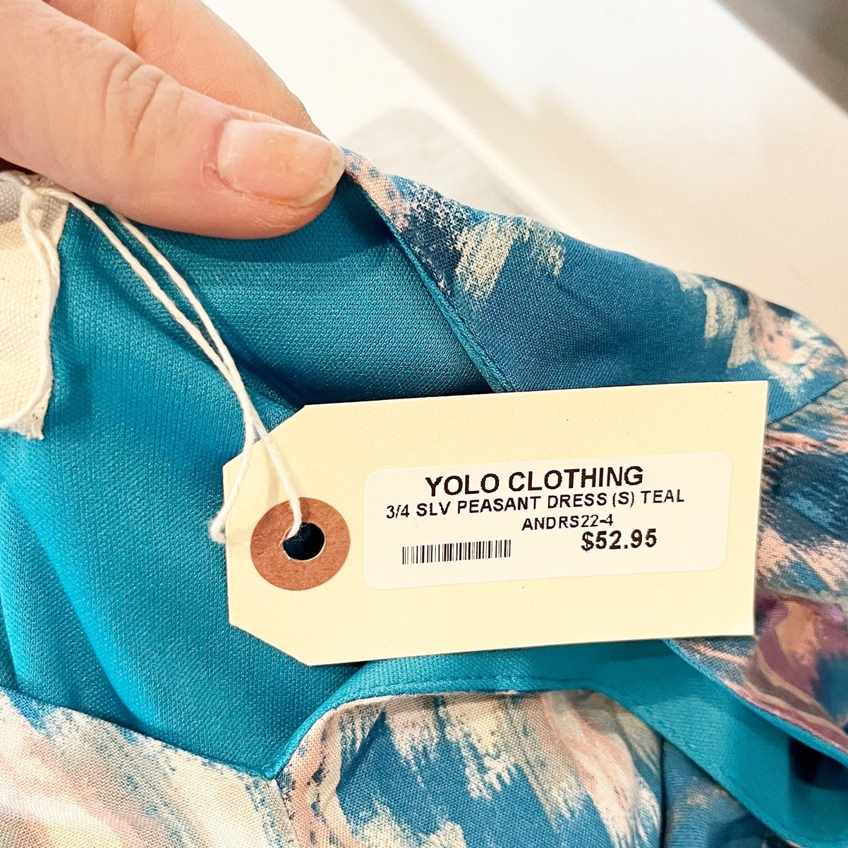 3/4 sleeve, printed, elastic waist, mini dress, peasant dress, bohemian, brunches, summer, boho-chic, teal, blue, green, elbow length puff sleeves