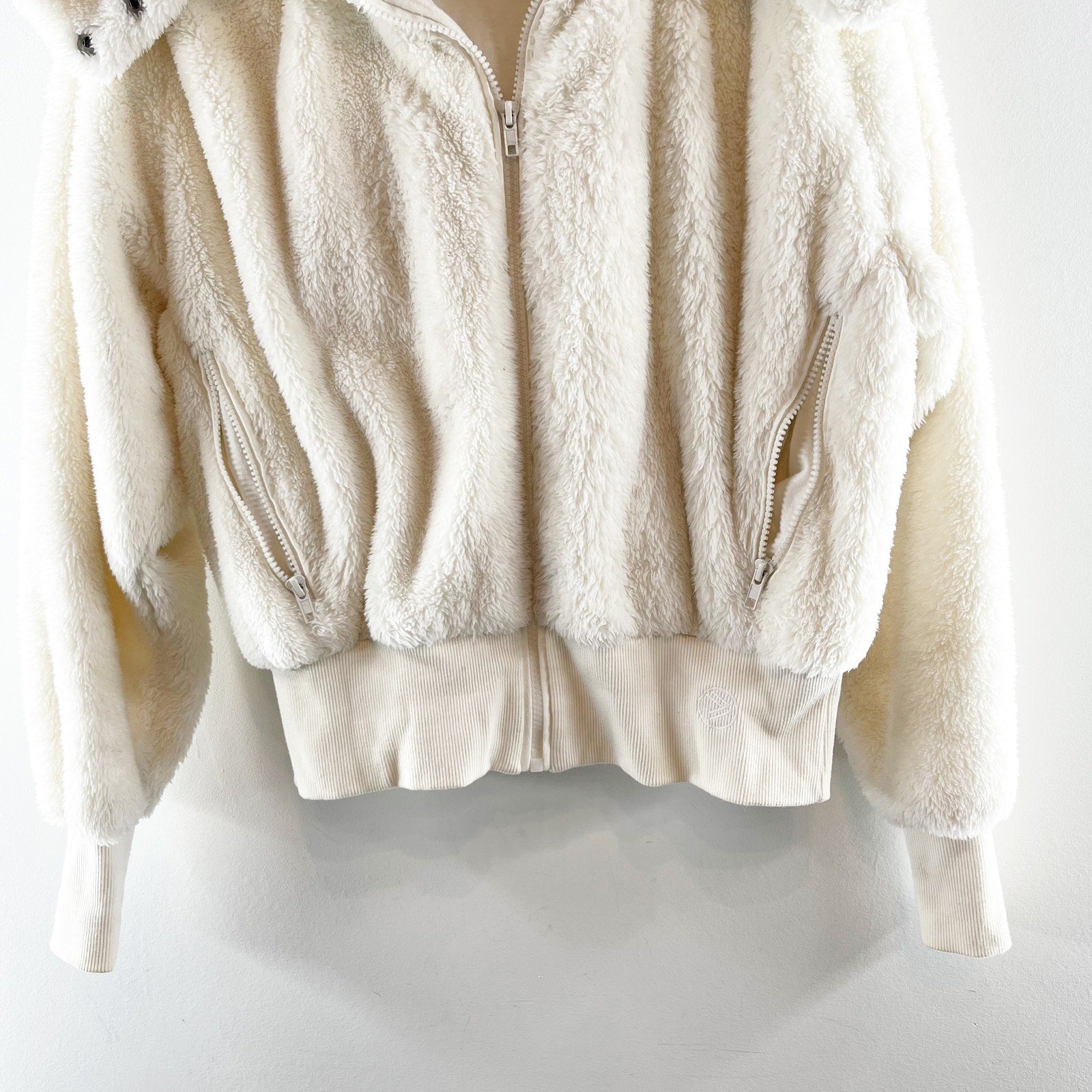 long sleeve, full zip, pocket, hooded, sherpa, teddy hoodie, winter, outdoor, outerwear, layering, soft, casual, cream, white, ivory, fleece, sherpa