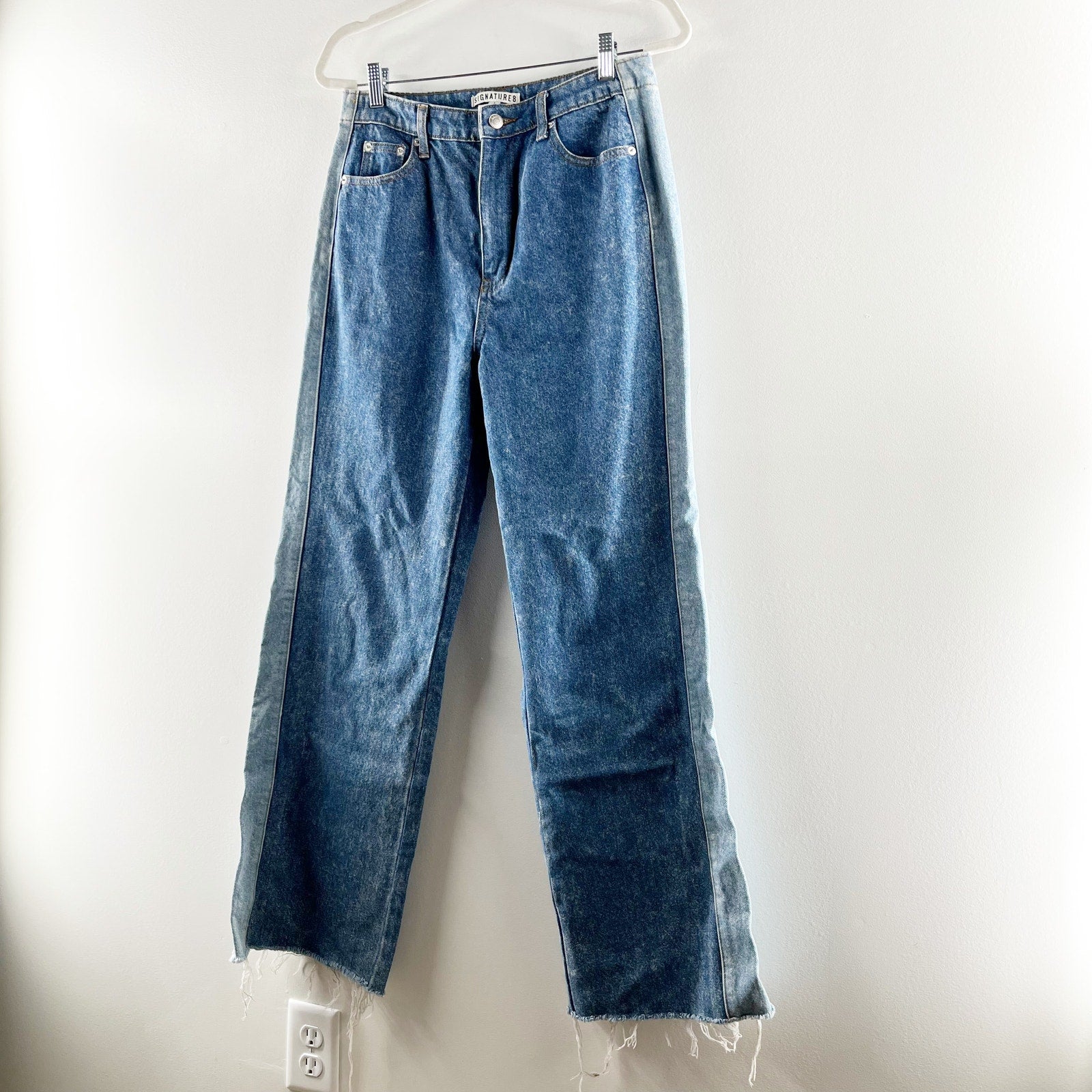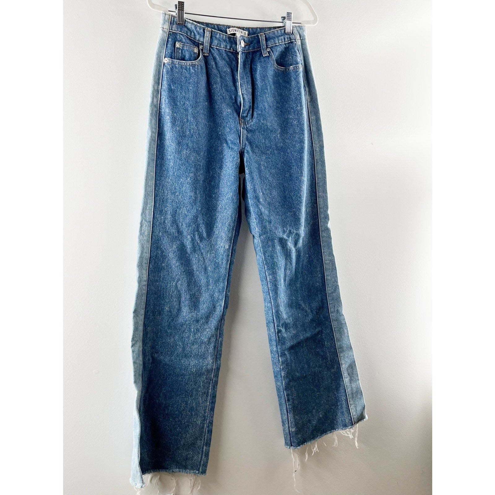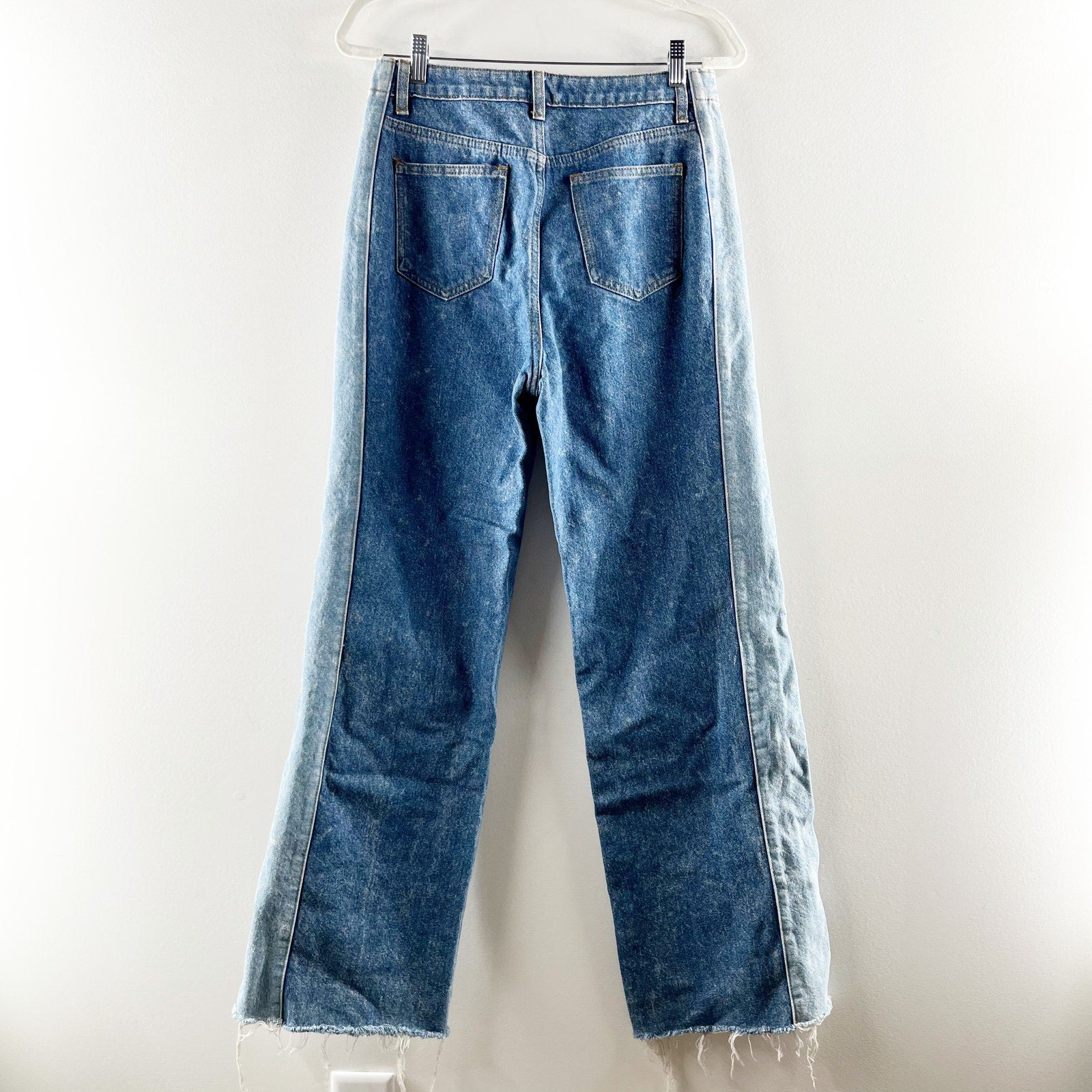 two-tone, wide leg, fray hem, denim, button closure, pockets, casual, baggy jeans, streetwear, retro, vintage, rugged, cotton, colorblock, raw hem