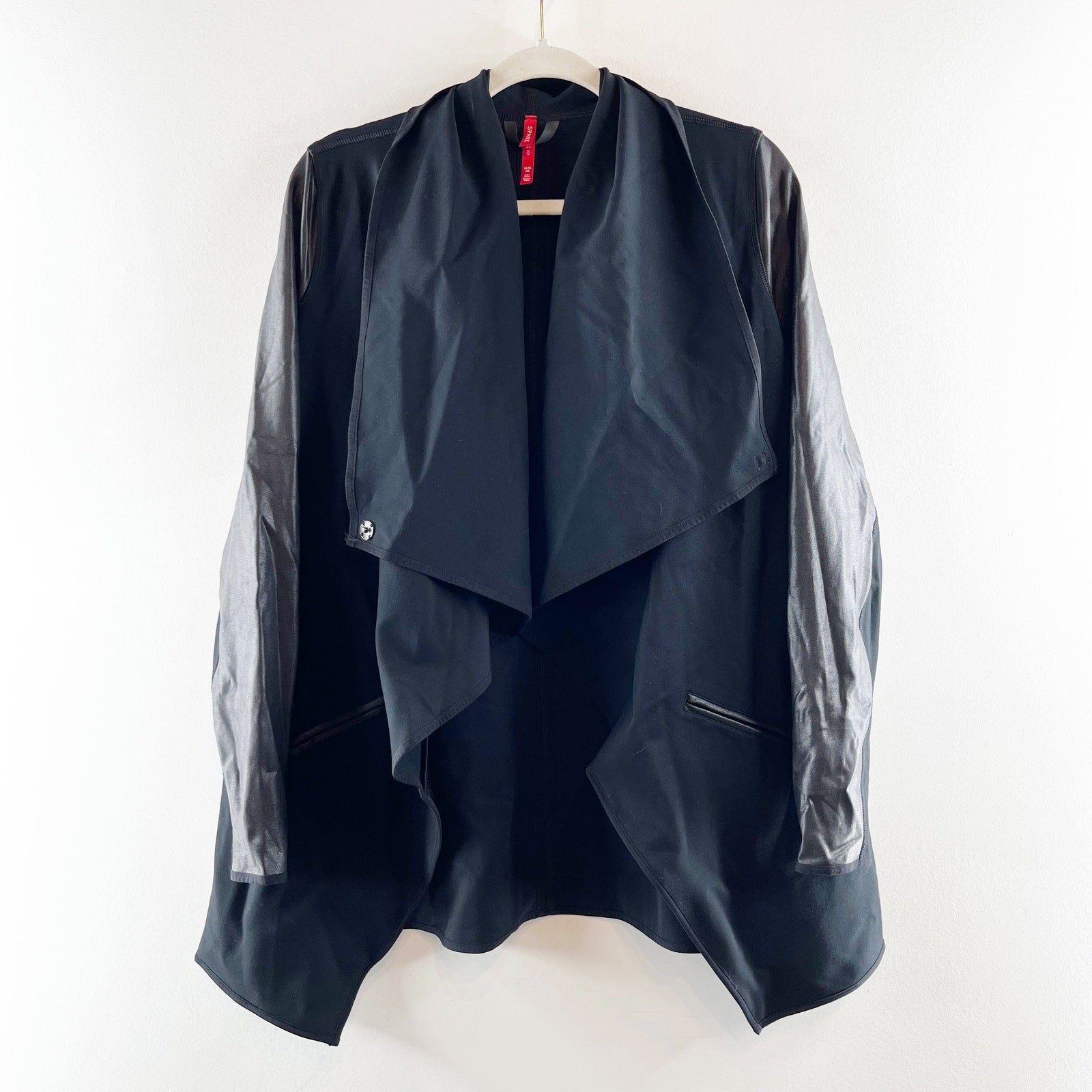 faux leather sleeves, draped, jacket, blazer, stretch, black