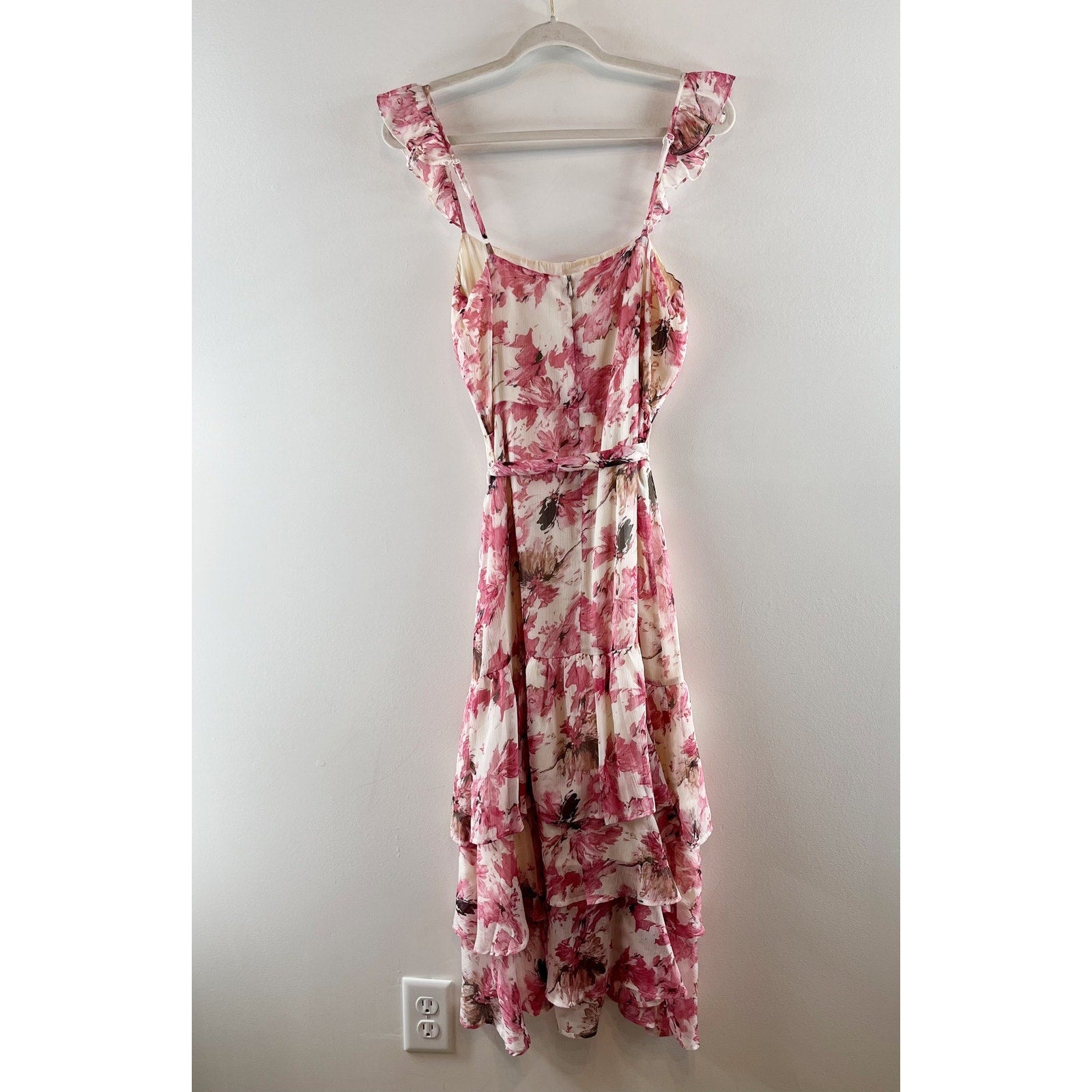 Sugar + Lips Floral Belted Tie Waist Tiered Ruffle Hem Midi Dress Pink Medium
