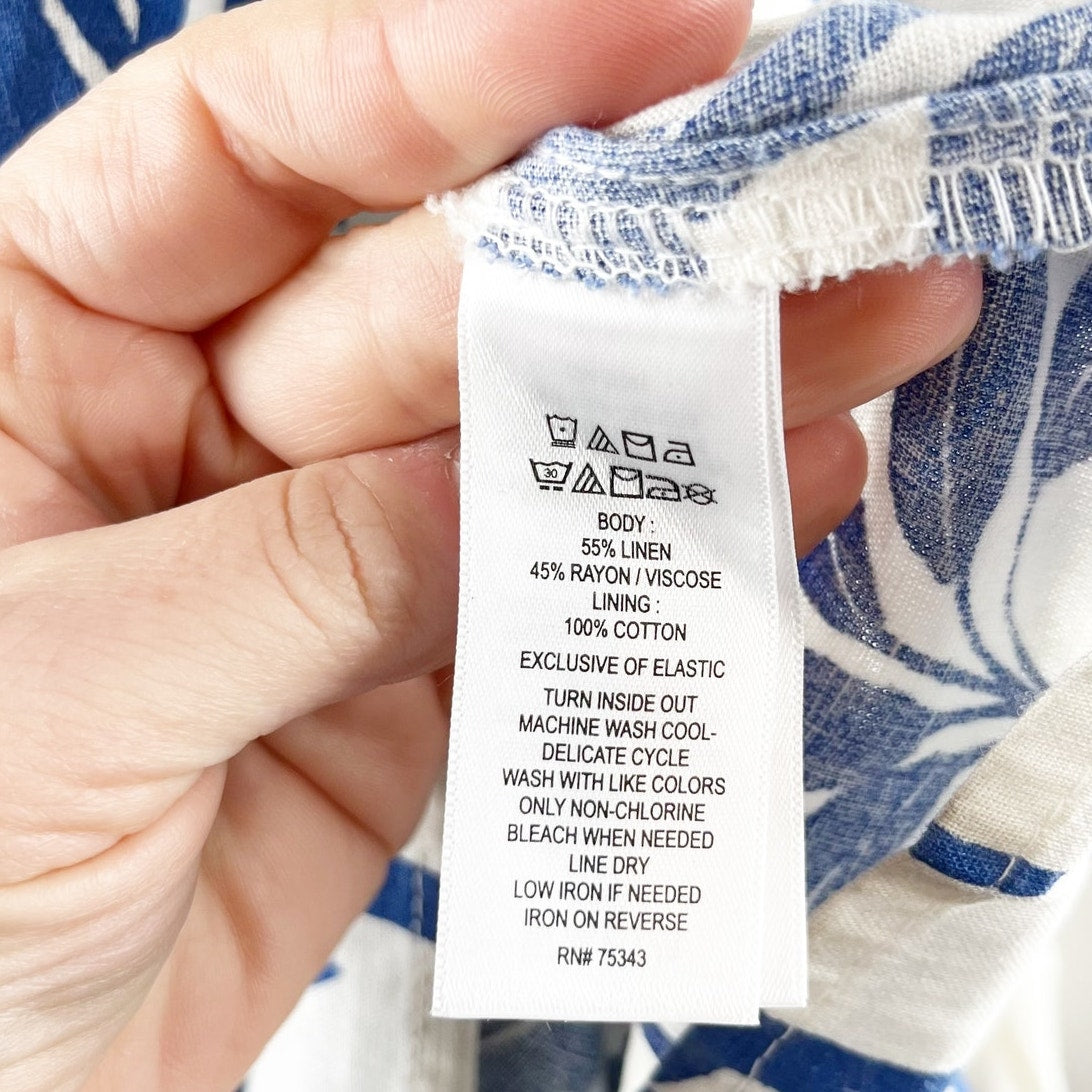 midi, linen blend, blue, white, floral, tropical, vacation, lined, smocked back, resort, a-line