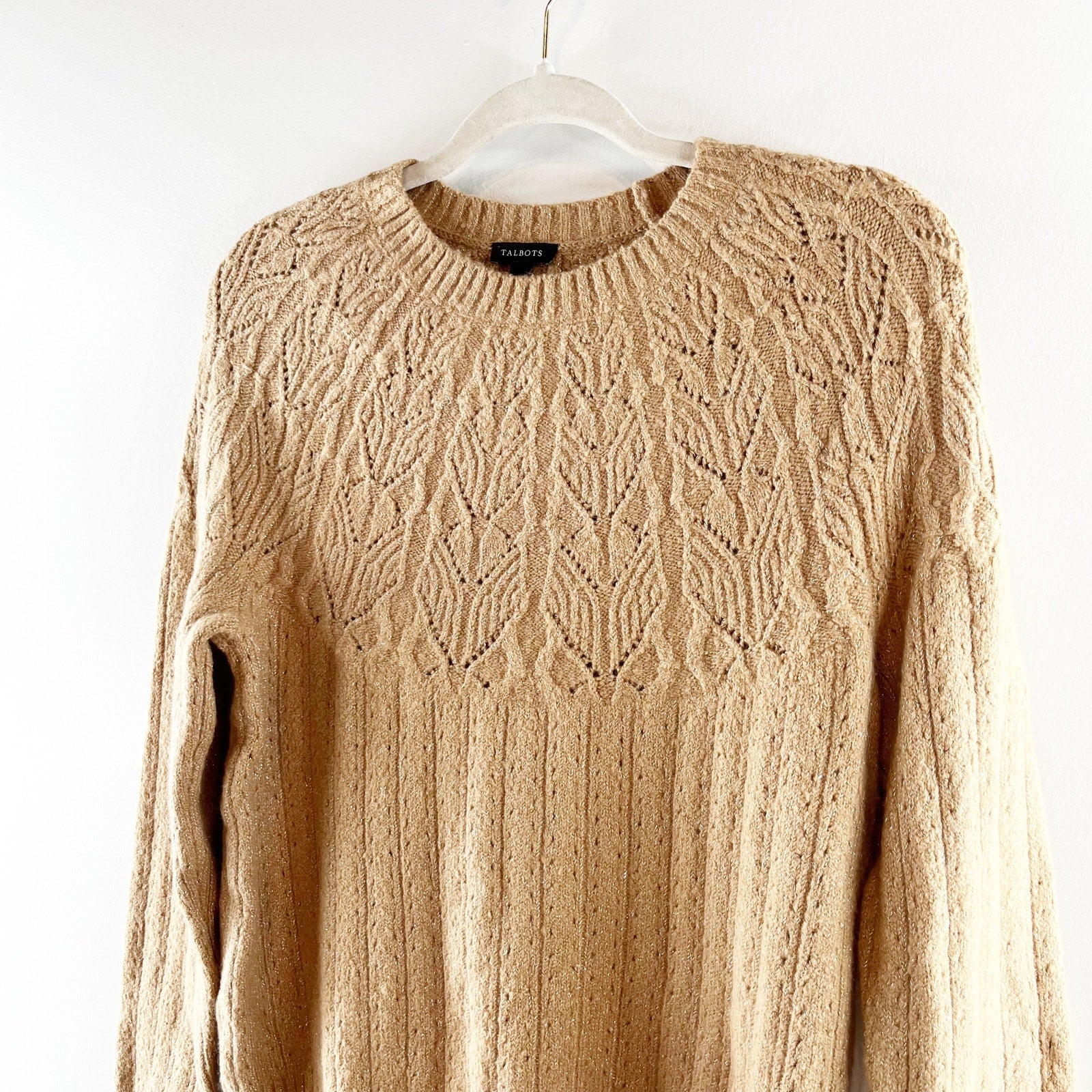 Talbots Long Sleeve Metallic Pointelle Sweater Tan Beige Small