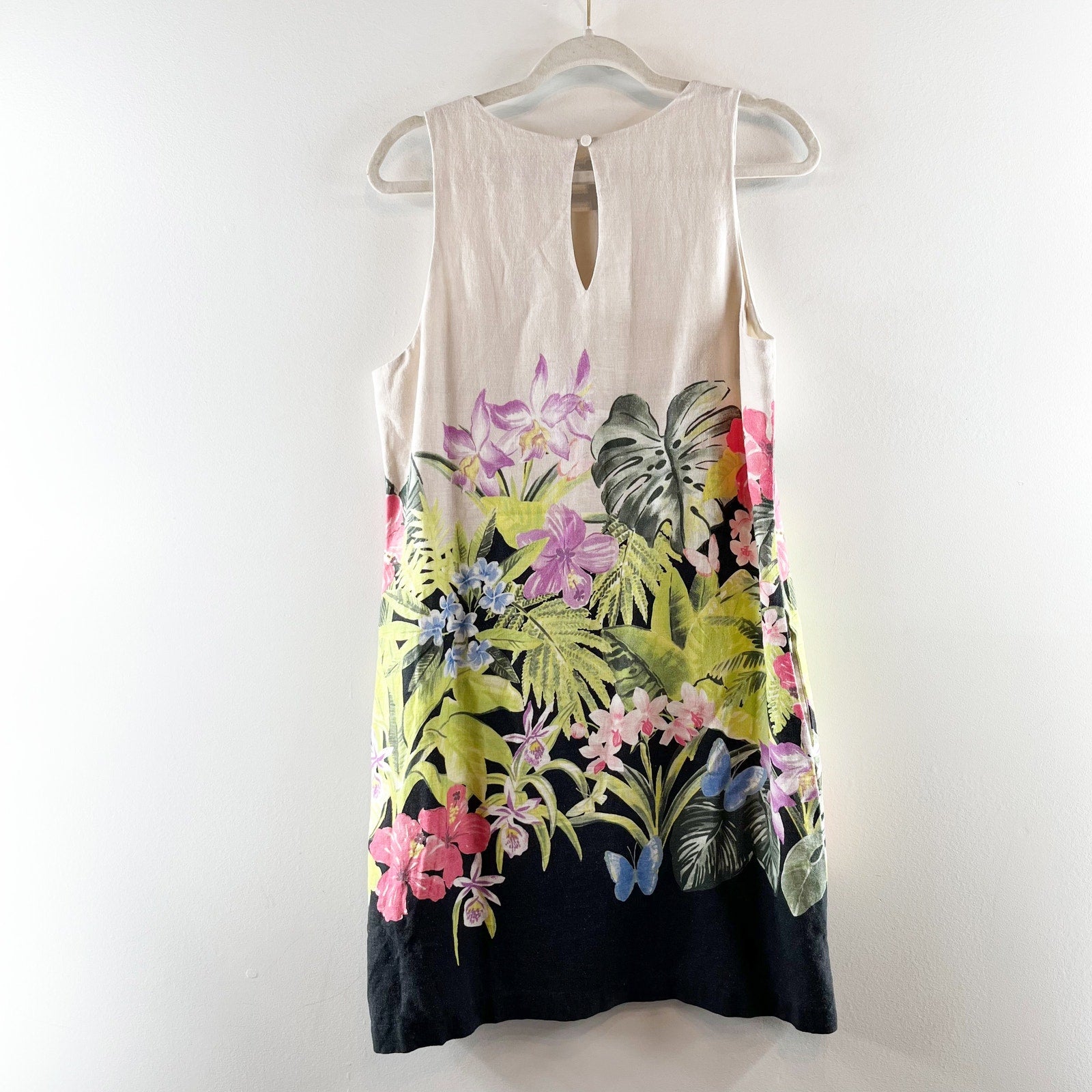 sleeveless, lined, linen blend, floral, tropical, summer, shift, mini, dress, tan, beige, vacation, resort
