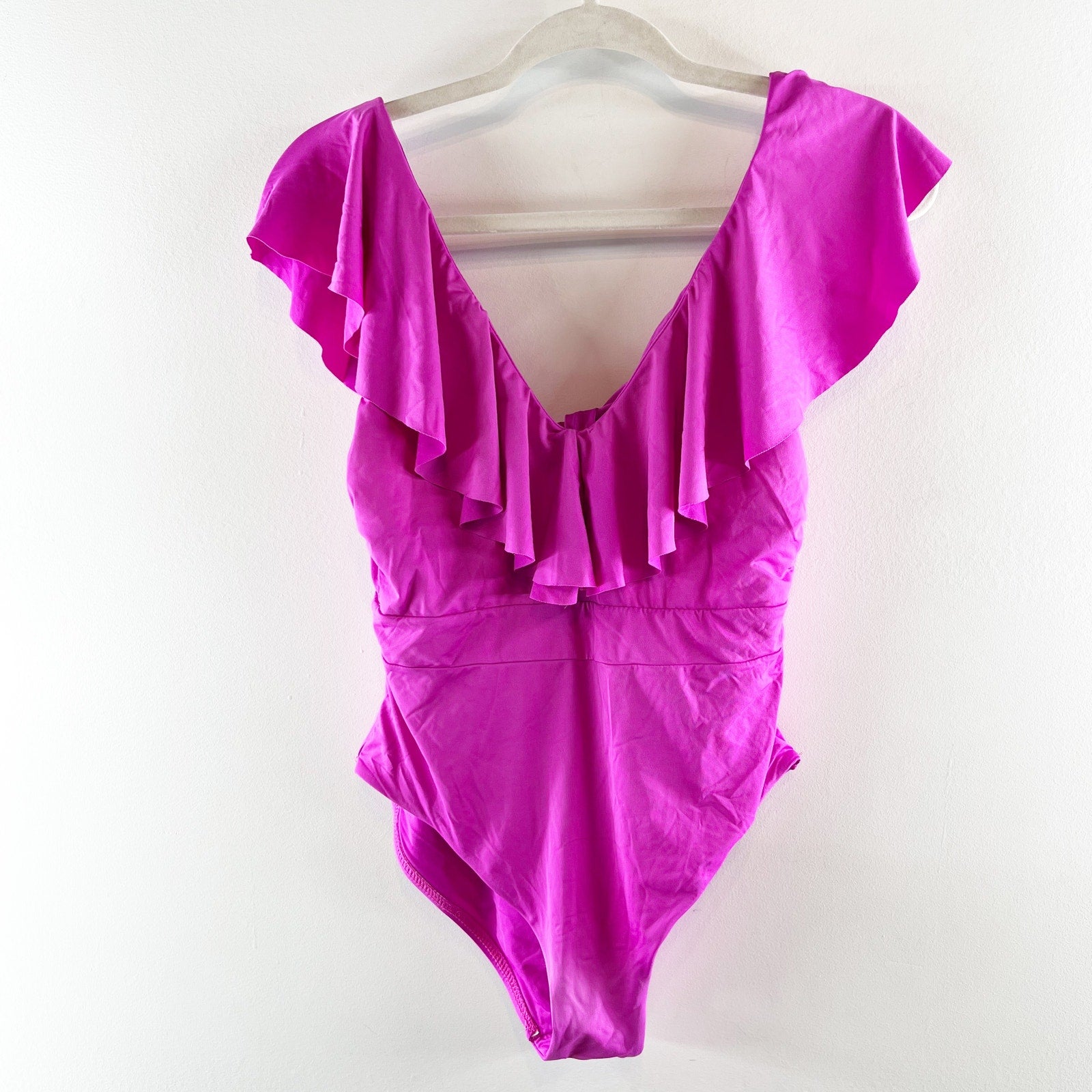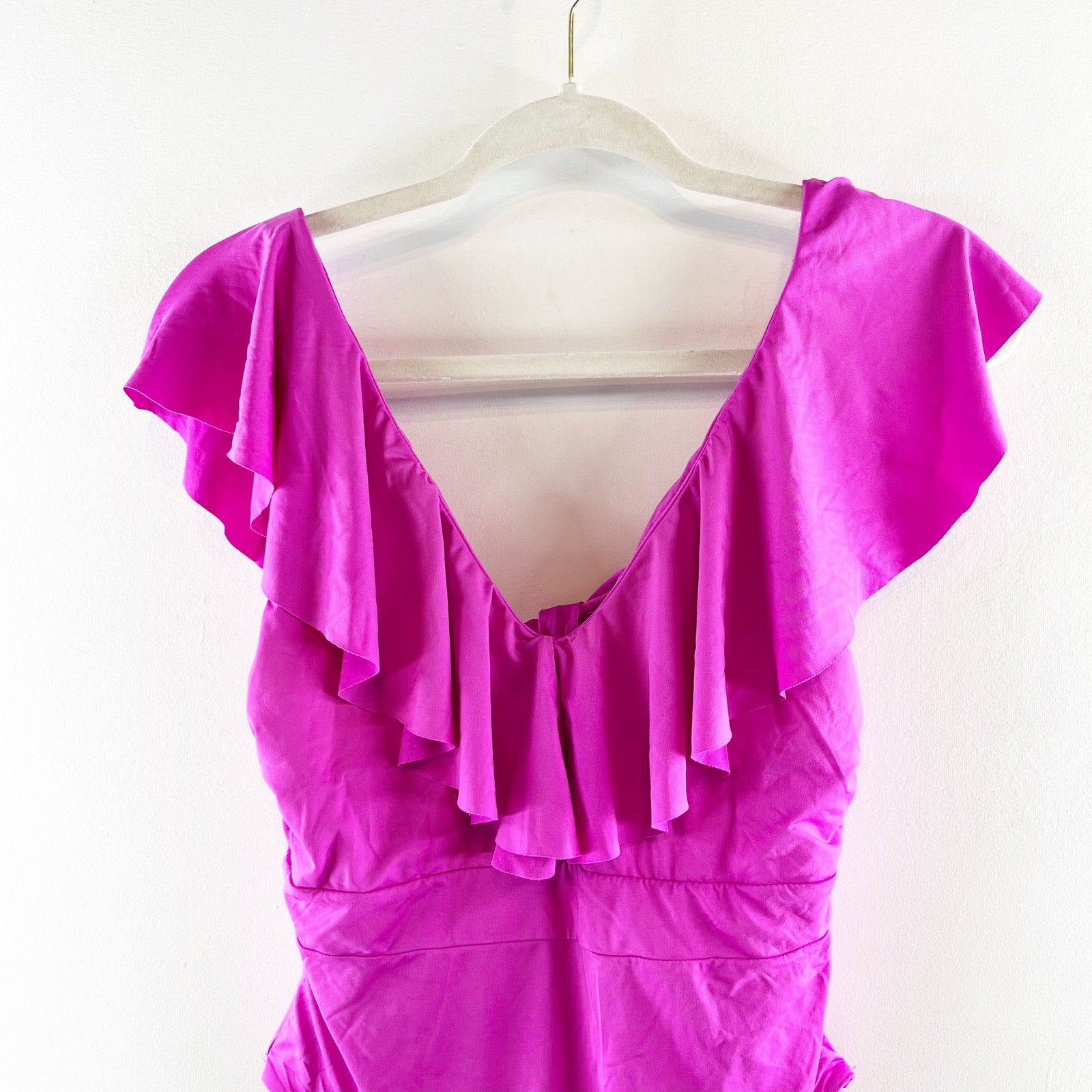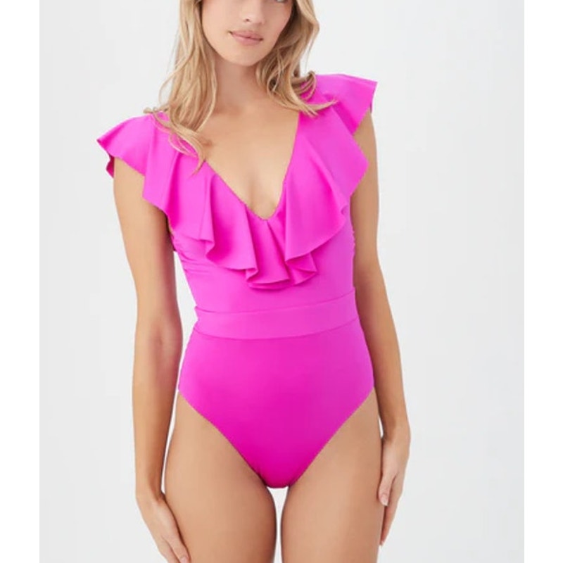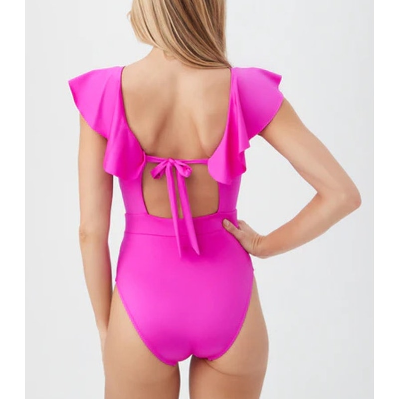 ruffle trim, v-neckline, solid, tie back, swimsuit, swimwear, beach, summer, pool, pink, bright, one piece, bathing suit