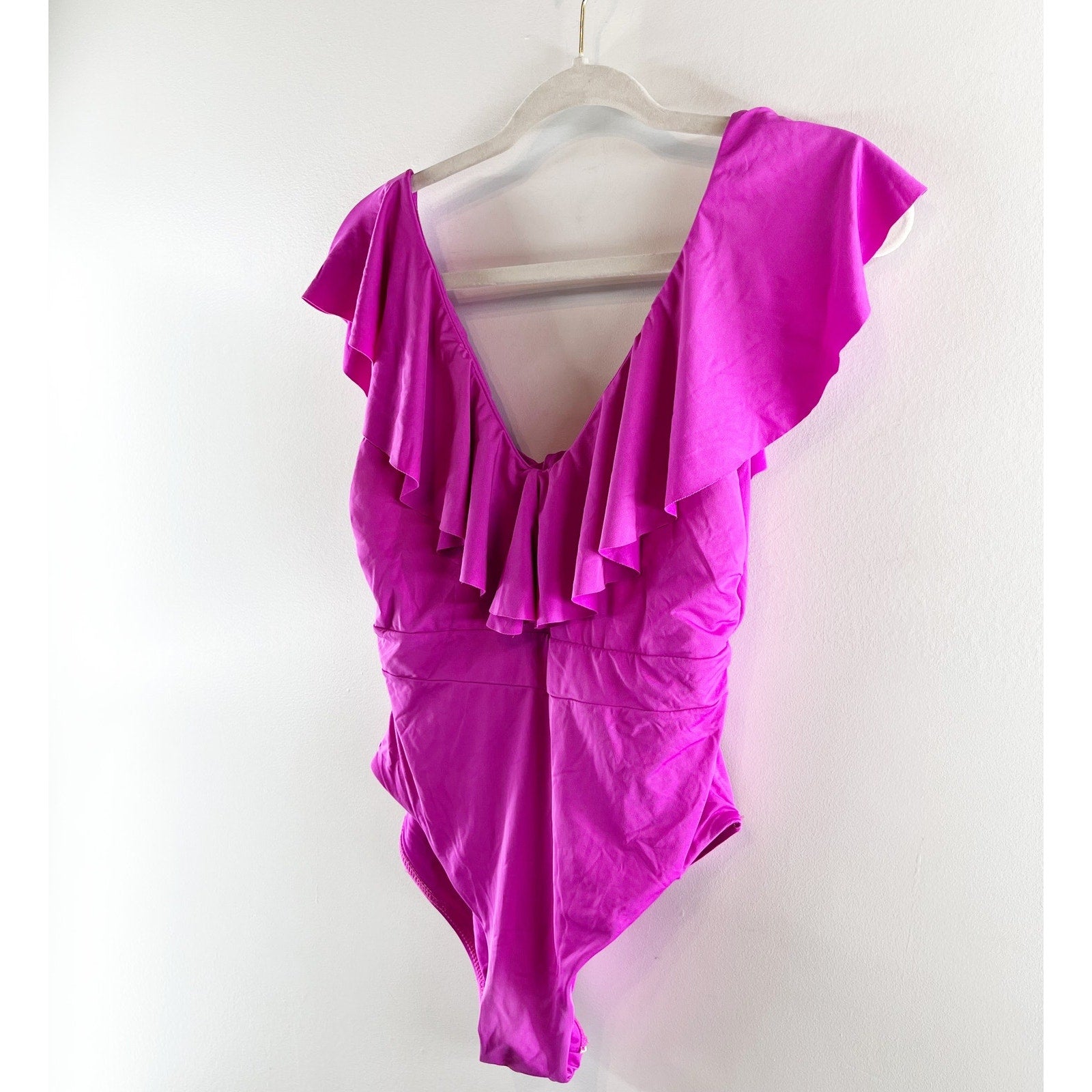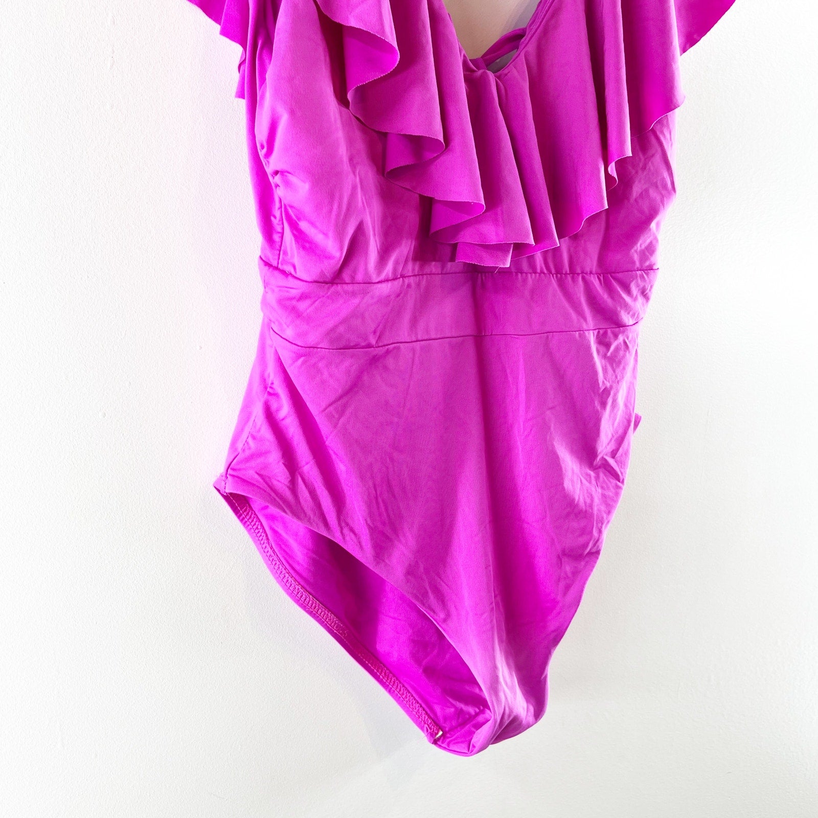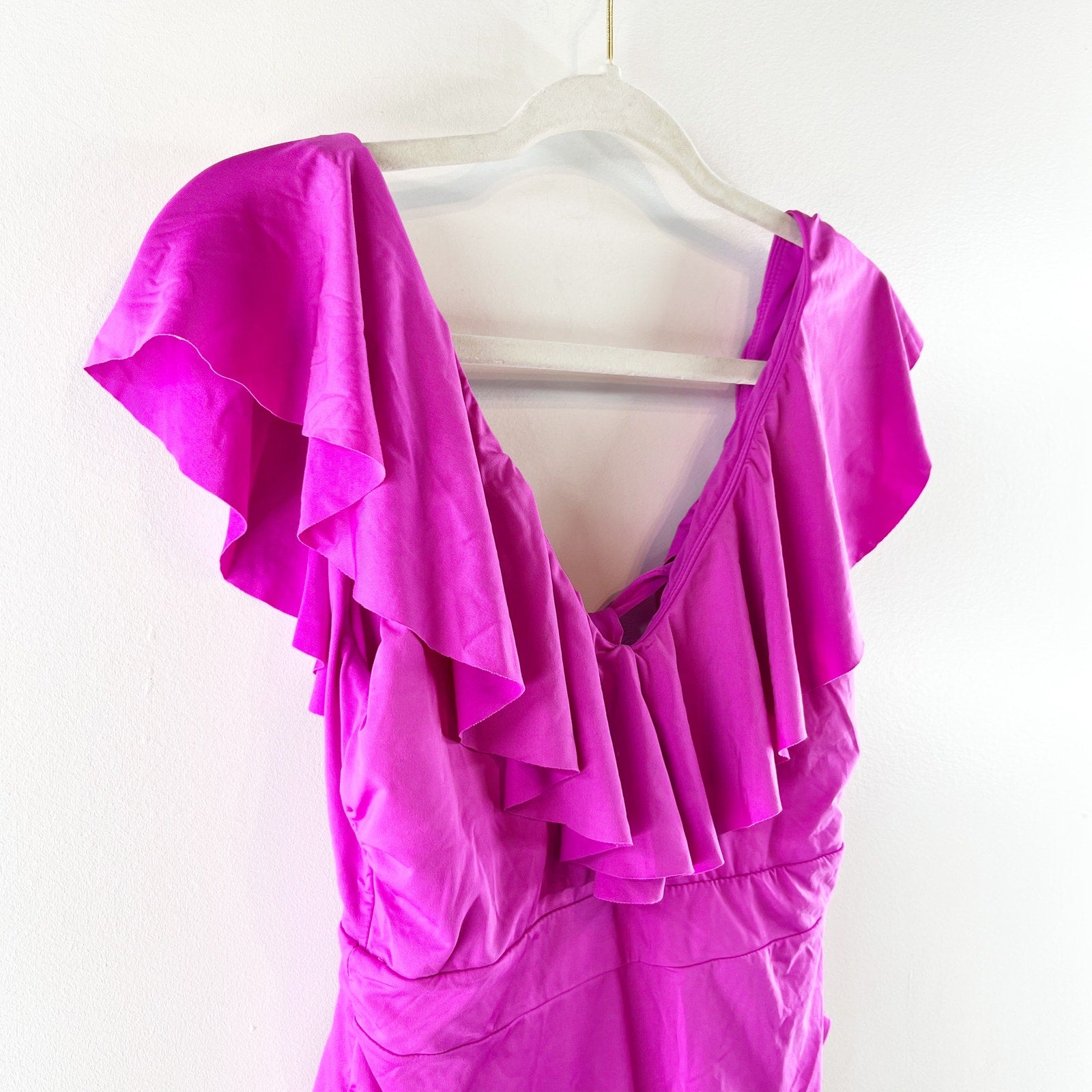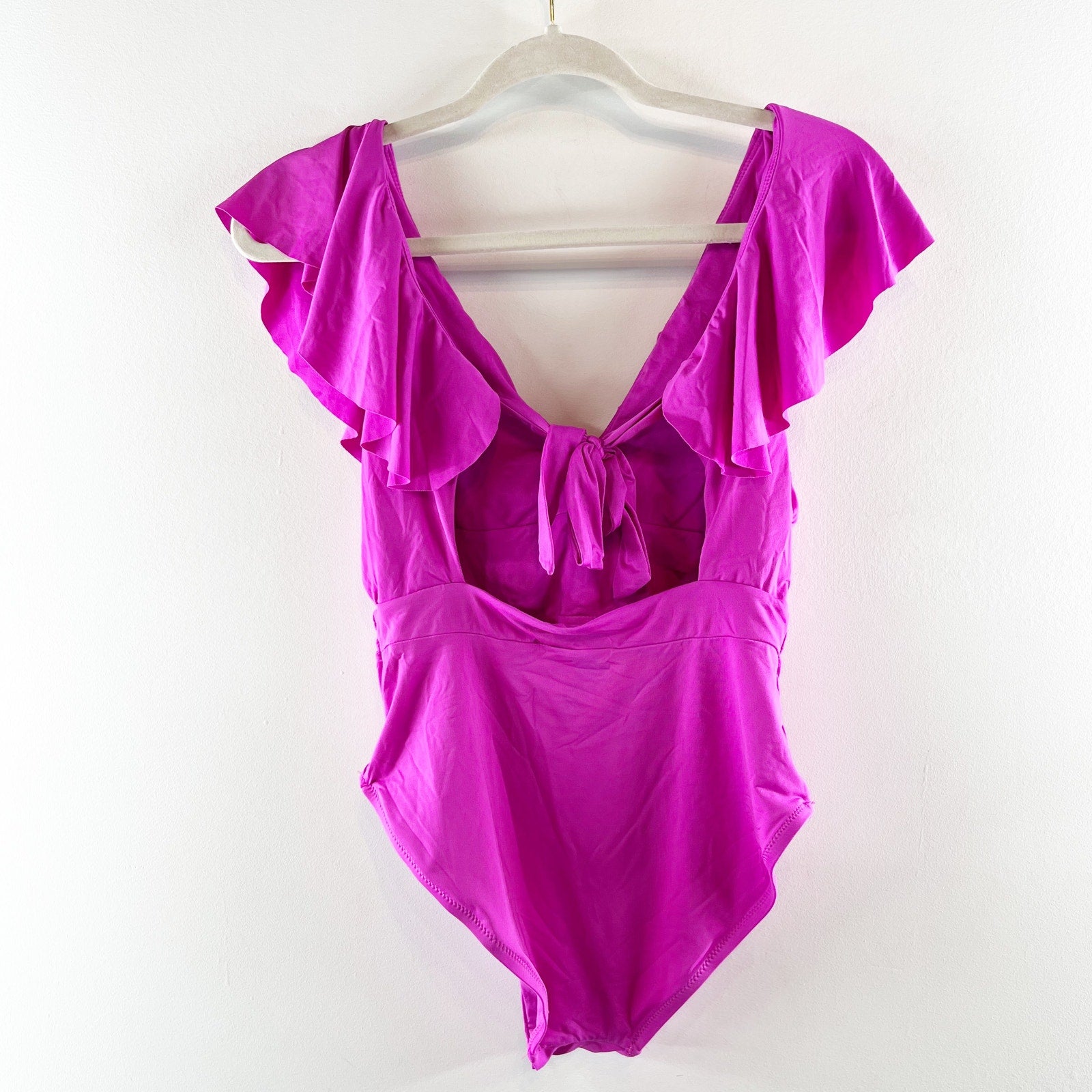 ruffle trim, v-neckline, solid, tie back, swimsuit, swimwear, beach, summer, pool, pink, bright, one piece, bathing suit