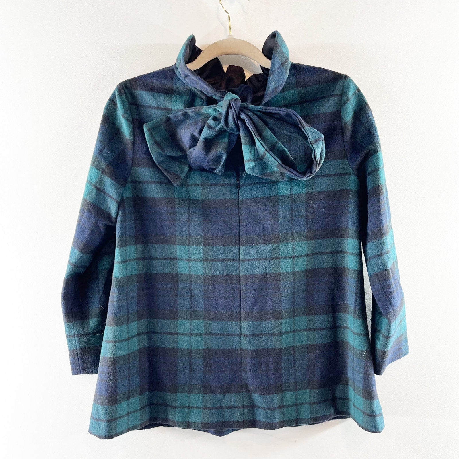 wool blend, lined, 3/4 sleeves, plaid, bow tie back, holiday, christmas, ruffle neckline