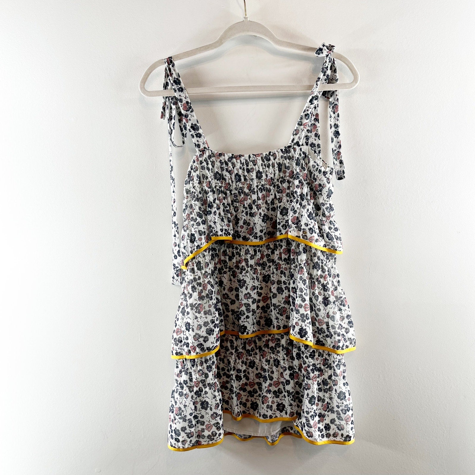tie straps, tiered, ruffle, mini, cottagecore, floral, dress, blue, white, yellow trim, sundress, square neckline