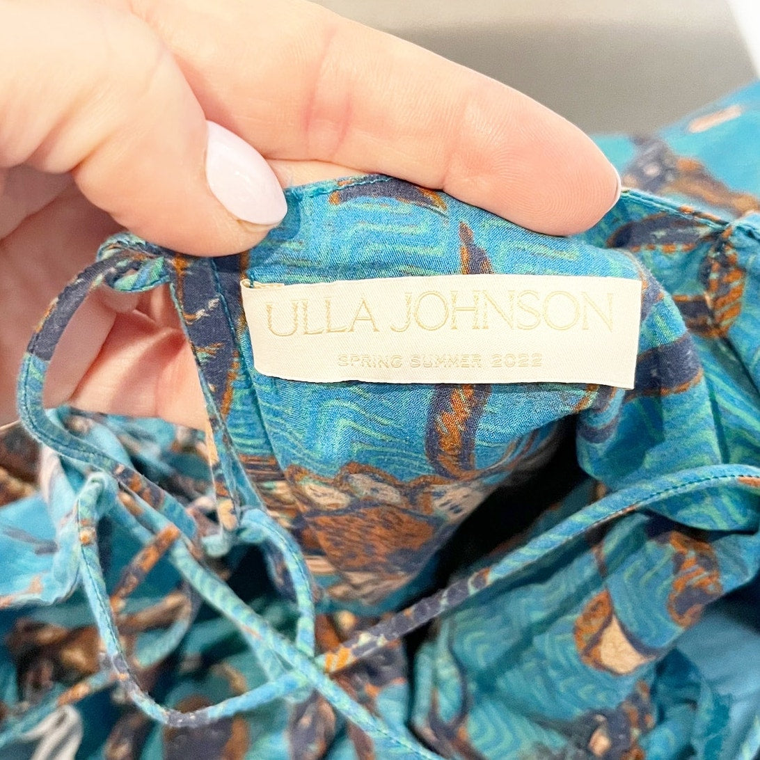 Ulla Johnson Carlotta Puff Short Sleeve Peplum Floral Cropped Top Blue Teal 2