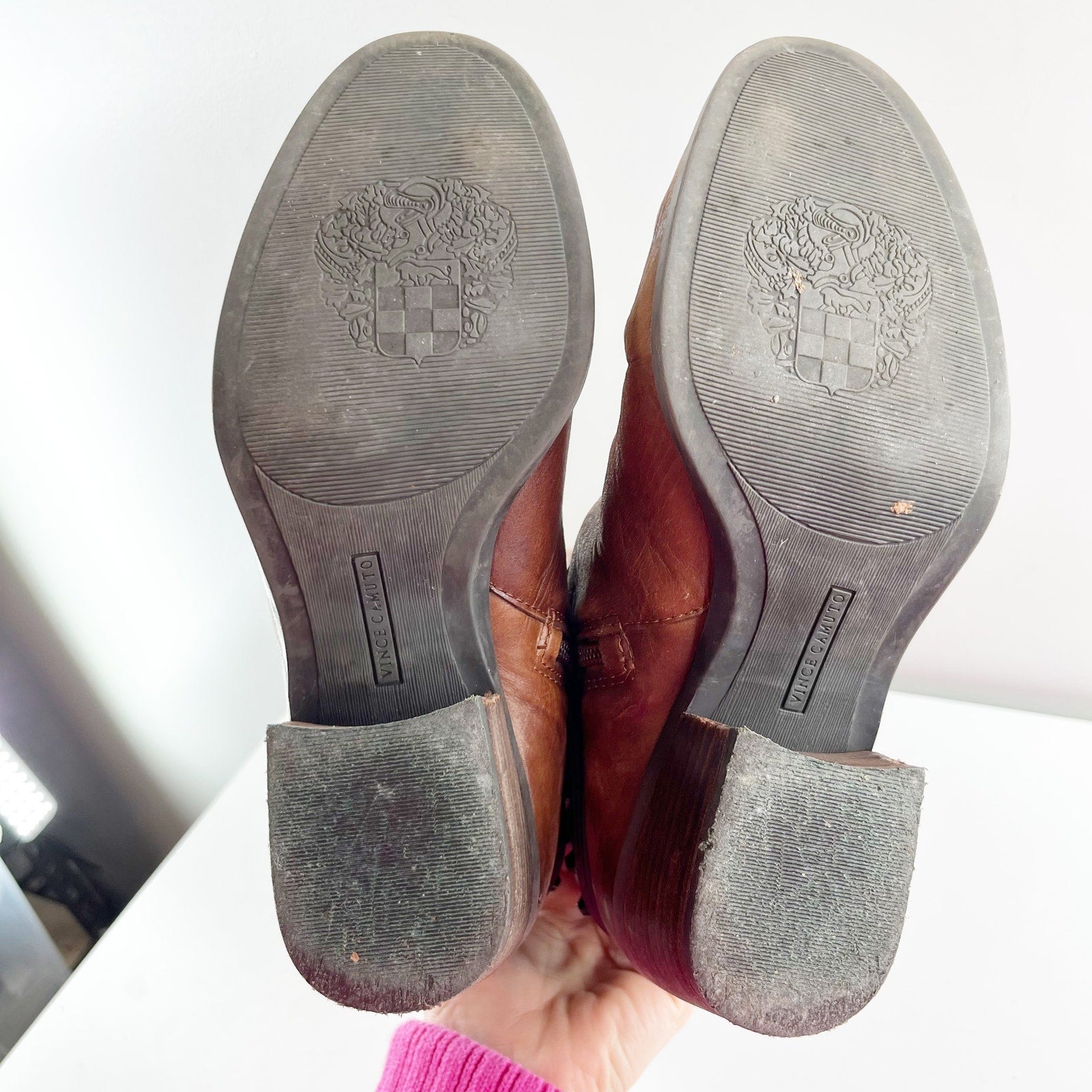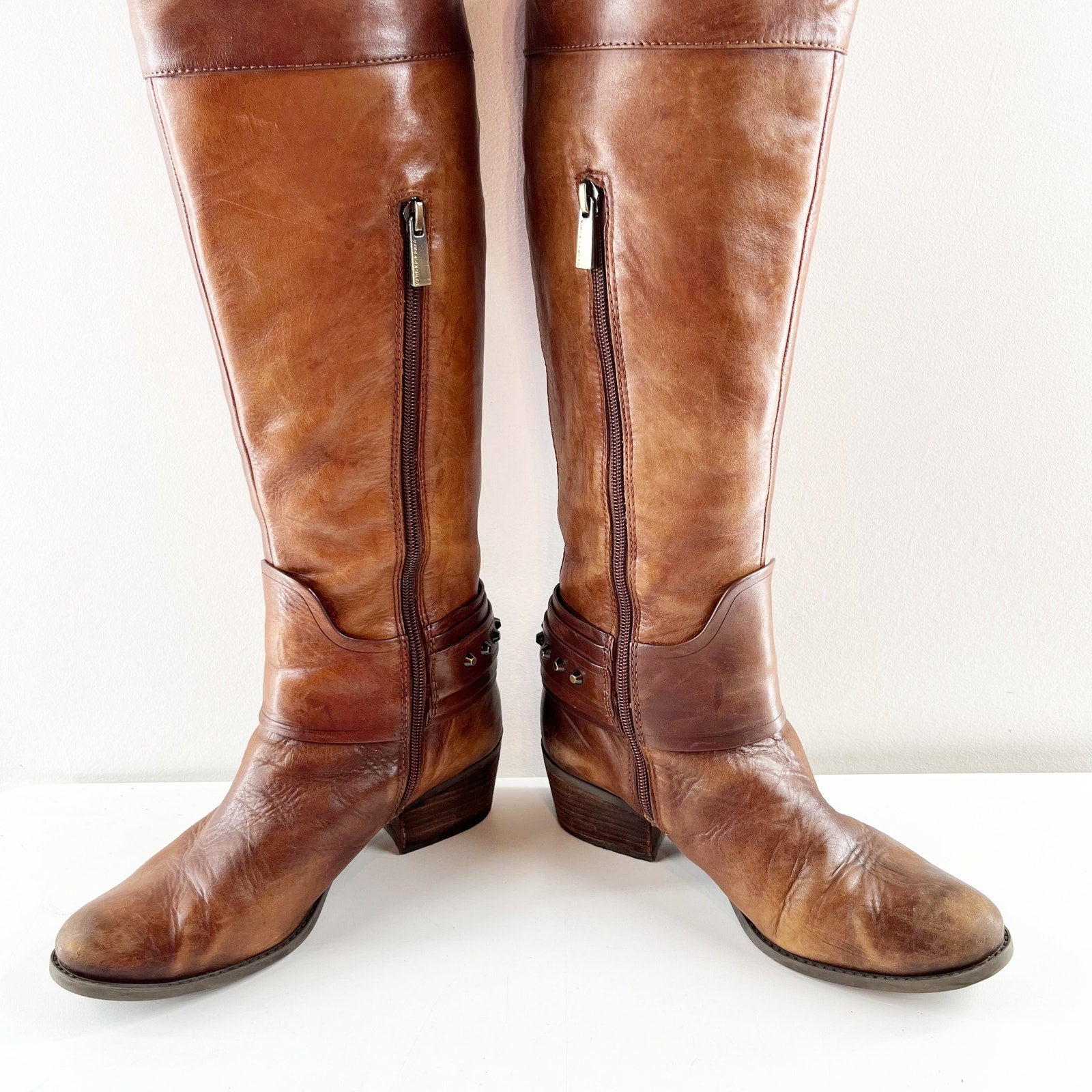 Vince Camuto Leather Beatrix Block Stacked Heel Knee High Riding Boots Brown 7.5