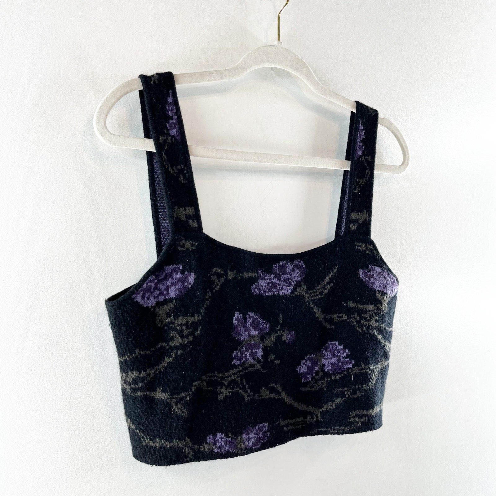 sleeveless, floral, black, purple, wool cashmere blend, cropped, tank, top, square neckline, bralette, sweater