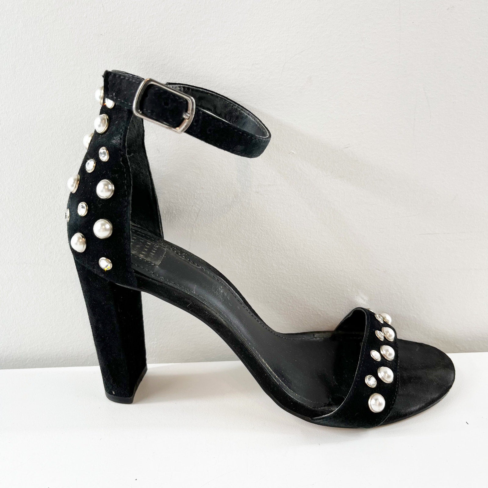 pearl and rhinestone studded, open toe, suede, black, party, cocktail, block heel, pumps, sandals, holiday, adjustable ankle strap