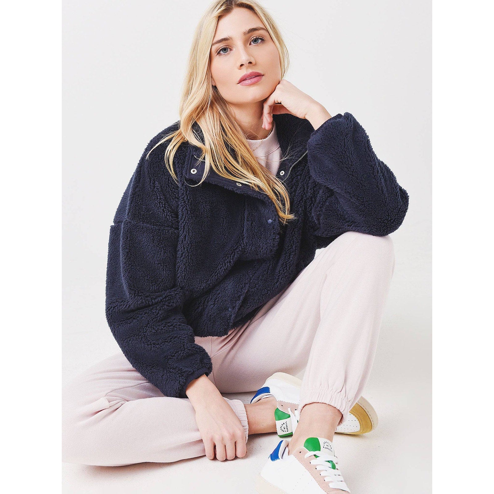 long sleeve, full zip, snap button closure, sherpa, winter, outdoor, jacket, teddy jacket, outerwear, navy blue, side slant pockets, fleece