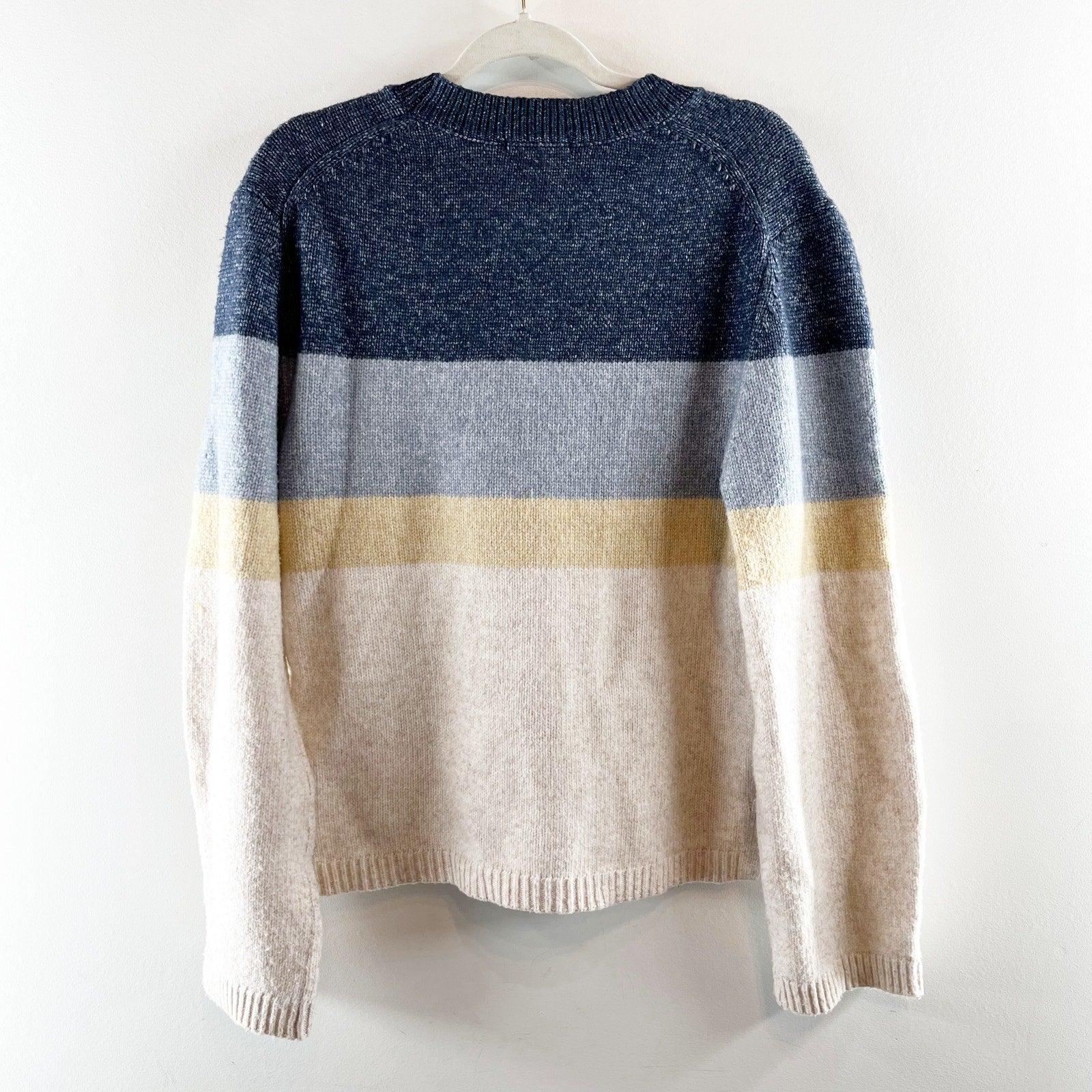 long sleeve, striped, blue, tan, cream, beige, crewneck, soft, warm, cozy, pullover, sweater