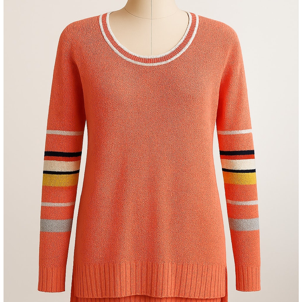 crewneck, striped, varsity, sweater, top, long sleeve, lightweight, knit, orange
