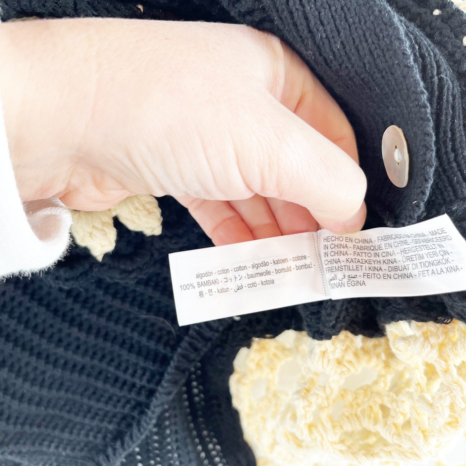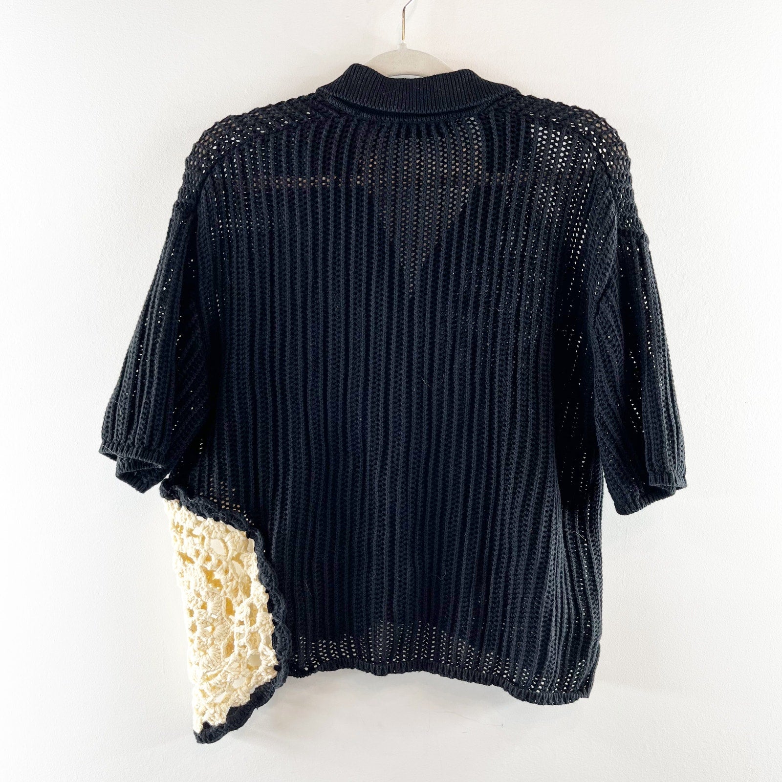 button up, collar, short sleeve, crochet knit, grandma core, cottagecore, black, cream floral detail, cardigan, sweater, boho