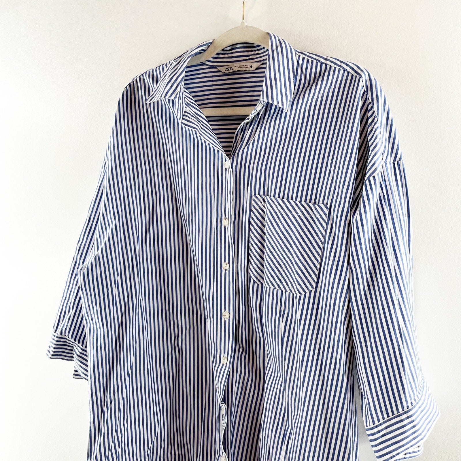 Zara Striped 3/4 Sleeve Oversized Poplin Tunic Button-Up Shirt Blue White XS